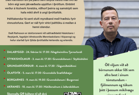 Fréttir og tilkynningararrow-rightarrow-right 1 feb Vinnustofa fyrir foreldra barna í íþróttastarfi Íþróttahéruð á Vesturlandi (HSH, ÍA, UDN og UMSB) bjóða foreldrum/forráðamönnum iðkenda á sínu starfsvæði að taka þátt í áhugaverðri og… 3 dagar síðan 26 des Jóla og nýárskveðja Ungmennasamband Dalamanna og Norður Breiðfirðinga sendir sendir sambandsaðilum sínum, íþrótta- og ungmennafélögum, samstarfsaðilum og landsmönnum öllum bestu óskir um gleðileg… 1 mánuður síðan 18 sep Íþróttavika Evrópu 2025- Dagskrá UDN Íþróttavika Evrópu 2025 – Dagskrá á sambandssvæði UDN Íþróttavika Evrópu (European Week of Sport) er haldin 23. – 30. september… 5 mánuðir síðan 12 ágú UDN á ULM 2025 UDN átti sex þátttakendur á ULM á Egilsstöðum sem fram fór um Verslunarmannahelgina. Fámennt en góðmennt og tjaldbúðir í smærri… 6 mánuðir síðan 12 ágú Glæsilegur árangur Undra á Króksmótinu Síðast liðna helgi 9.- 10. ágúst fór Króksmótið svokallaða fram á Sauðárkróki í fínasta veðri. Mótið er fyrir 6.-7. flokk… 6 mánuðir síðan Eldri fréttir & tilkynningarInniaðstaðaGolfhermir af bestu gerð þar sem hægt að leika marga af frægustu golfvöllum heimsMótaskráSkoðaðu næstu mótin okkar og skráðu þig í rástíma beint á vefsíðu okkarKennslaVið bjóðum uppá fyrsta flokks kennslu og námskeið fyrir alla aldurshópaViðburðir 24 febrúar 2026 Vinnustofa fyrir foreldra barna í íþróttastarfi BÓKA RÁSTÍMA BÓKA RÁSTÍMA