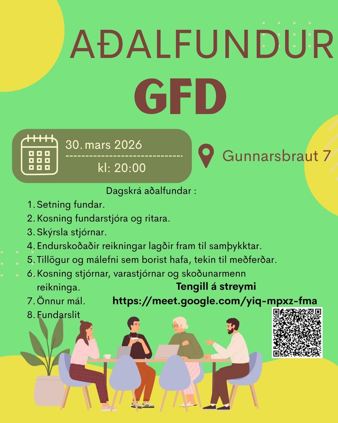 Aðalfundur GFD + Bæta við í google dagatalið + iCal / Outlook export Dags. 30. mars, 2026 Klukkan 20:00 - 21:00 Deila þessum viðburði