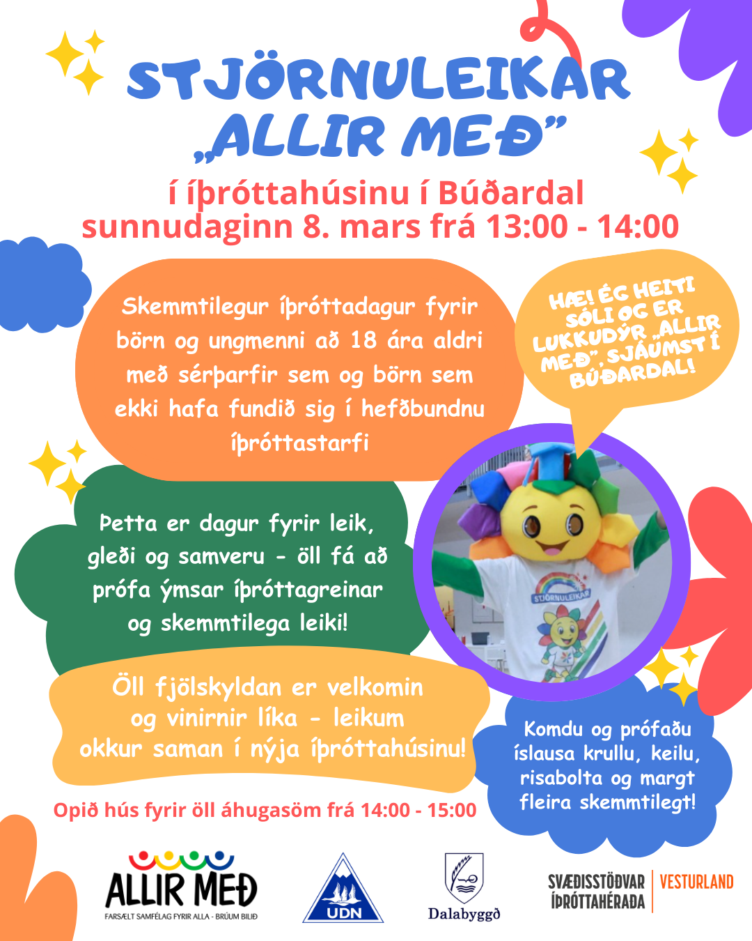 Þetta er dagur fyrir leik, gleði og samveru. Öll fá að prófa ýmsar íþróttagreinar og leiki ásamt því að hitta lukkudýr ,,Allir með“ verkefnisins, hann ofurskemmtilega Sóla.